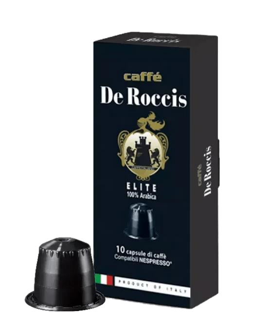 'De Roccis' coffee capsules are compatible with 'Nespresso' machines born from the careful selection of high-quality coffees from Central and South America, India and Africa roasted to perfection. The result is De Roccis ELITE: a perfect espresso, delicate, aromatic and smooth ideal for sophisticated and demanding coffee lovers....