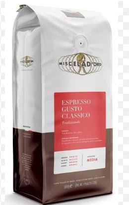 AraMiscela d’Oro ‘Espresso Gusto Classico’ coffee beans: a traditional Italian blend of Arabica and Robusta from South America & Africa. For a very intense espresso with a rich crema and persistent aftertaste. Ideal as a ristretto, espresso or as a base for a cappuccino or other milky drinks. Roasted in Italy. 1kg coffee beans.